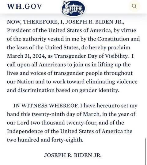 United states of Biden's America, Holy easter's day CANCELLED now is declared trans of visibility, thanks biden!