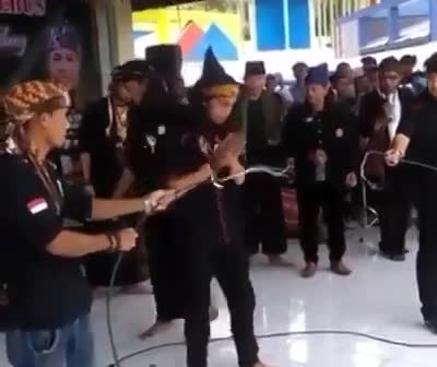 The fact, it was a traditional martial arts festival. They claimed that it gave them "inner" power and made them immune to electric shocks. No religion involved, only Indonesians and their ignorance.