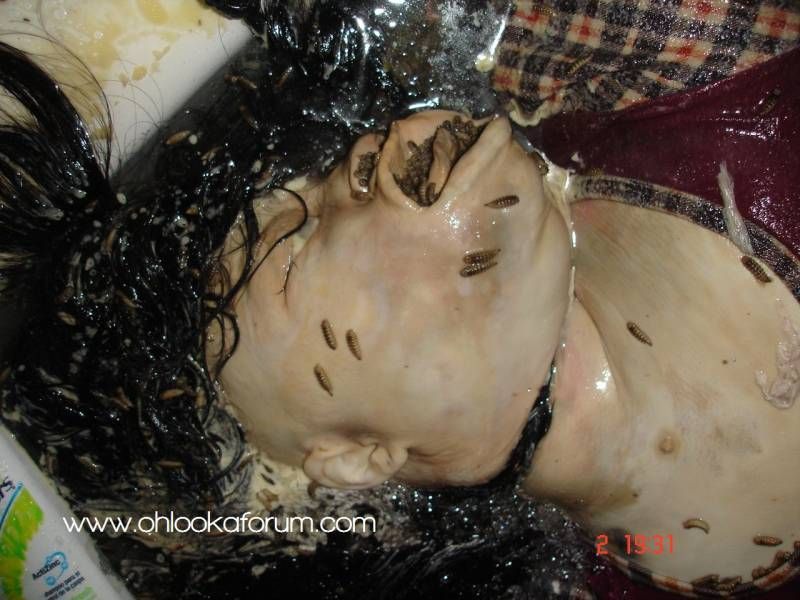 This is fucking rad. We've got multiple generations of maggots, so she's been in there for a few weeks because the ones in her mouth are ready to pupate. Some of her tissue looks like it might be adipocere, and the eyes haven't deflated. Fucking awesome.