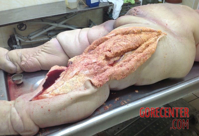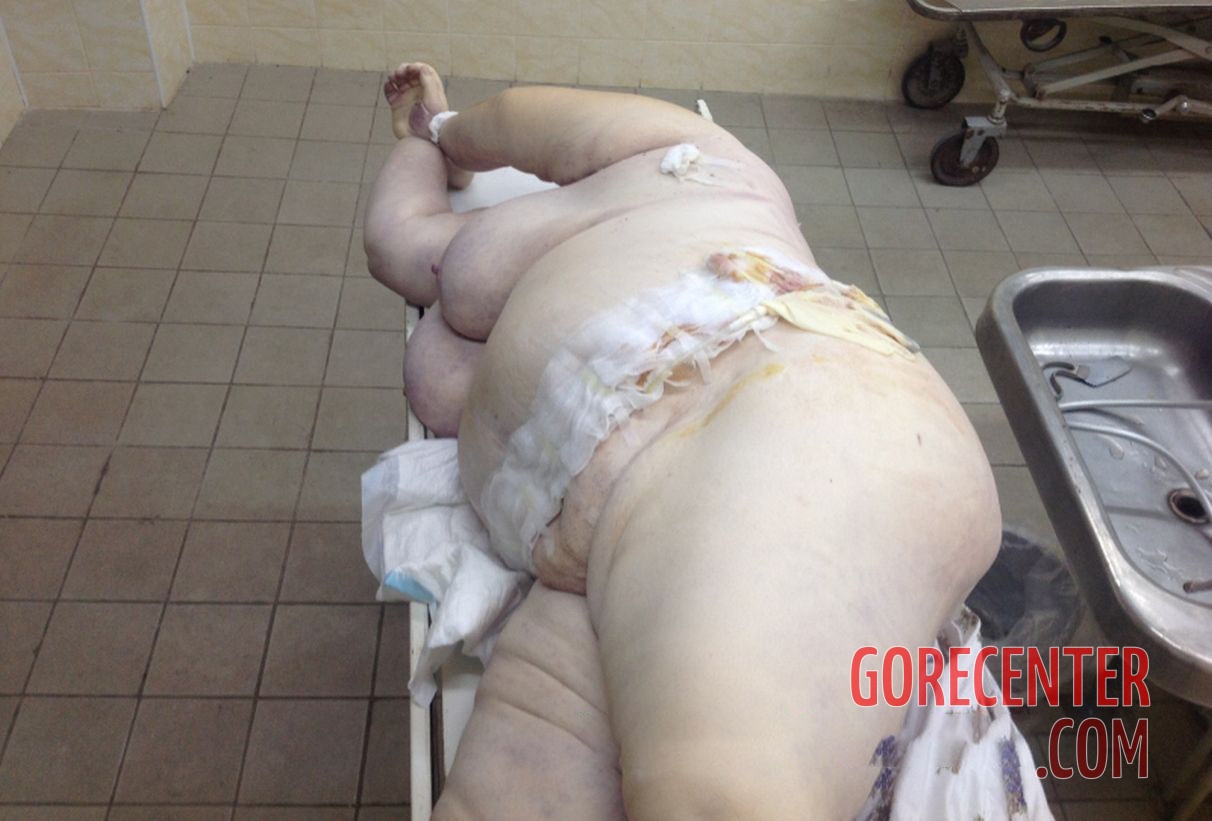 Photos from the morgue show a partial autopsy and the process of preparing for the funeral of a morbidly obese woman. She certainly died of health problems related to her weigh ..