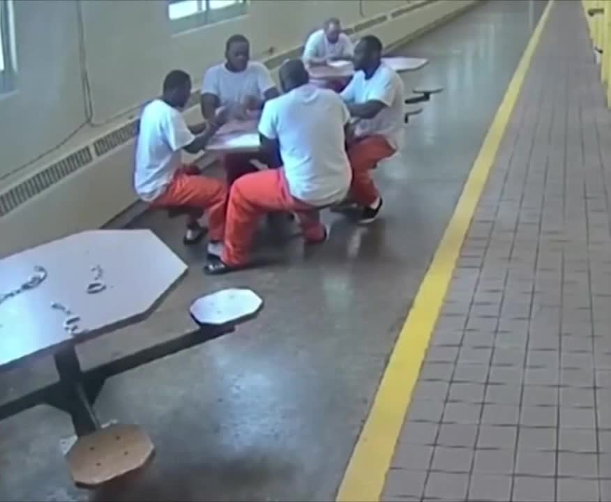 White Inmate Slips Cuffs. Hands Reparations to Chained Blacks
