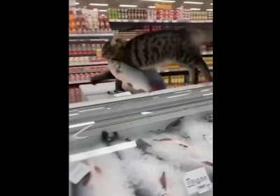 Cats have no concept of grocery stores. From their perspectives it just looks like a collection of fish to take, that appeared out of nowhere..... They also have no concept of fishing whatsoever, this is different from catching a fish with their mouth or paw.