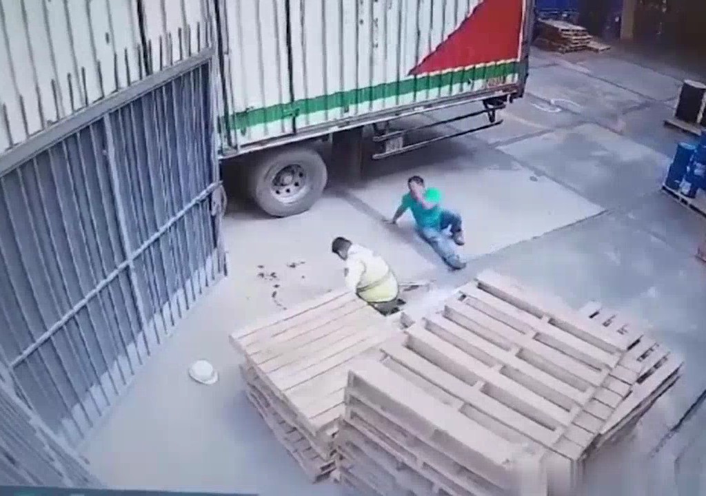 i mean USE BRAIN!!! it's BASIC FUCKING PHYSICS that truck doesn't go straight out cos it has no room, truck has to TURN and this moronic fuckwit starts closing the gate, not only that but he sticks his arm between the truck and gate aswell.