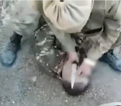 Human trophy collecting in modern times - Muslim soldier cuts off the ear of a dead soldier.