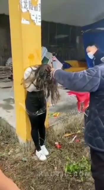 A beautiful Chinese woman was tied to a column and humiliated by scumbags.
