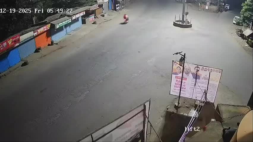Kolhapur, Maharashtra, India, December 19. Motorcyclist rides in front of a bus while making a turn and gets run over by it.