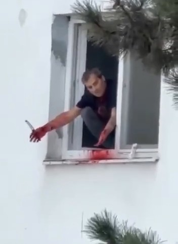 Good morning neighbors! - The man says as he cuts his wrists, arms and neck while sitting on the window.