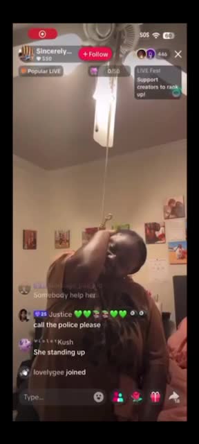 She's not even hanging. She's just standing there. Her fat ass pulled the fan down stretching the wires. She got hungry and gave that hanging bidness up cause it was too much work.