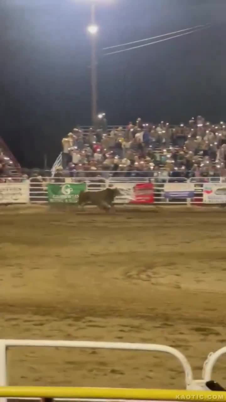 Wild bull jumps over the fence into the crowd at an Oregon rodeo, runs over people in the concession area.