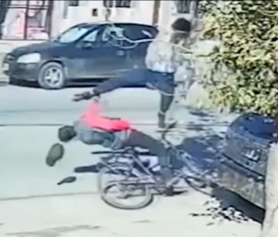 Bicycle thief is knocked out with a ninja flying kick.