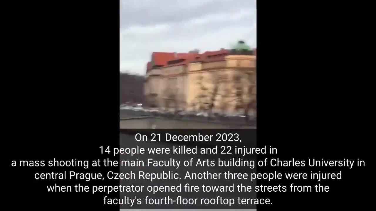 On 21 December 2023, a mass shooting occurred at Charles University's Faculty of Arts main building in central Prague, Czech Republic. A lone gunman, 24-year-old postgraduate student David Kozák, killed 13 people and injured 25 others before committing suicide after exchanging gunfire with police; an additional victim died indirectly from falling to her death while trying to escape the perpetrator.