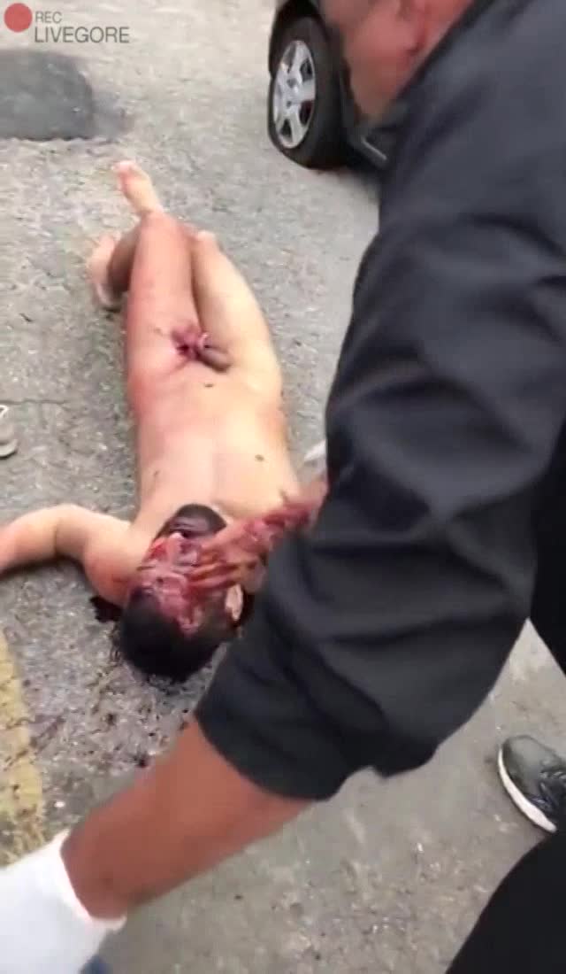 Naked Dead Rapist Leaking Blood on the Street. No Further information.