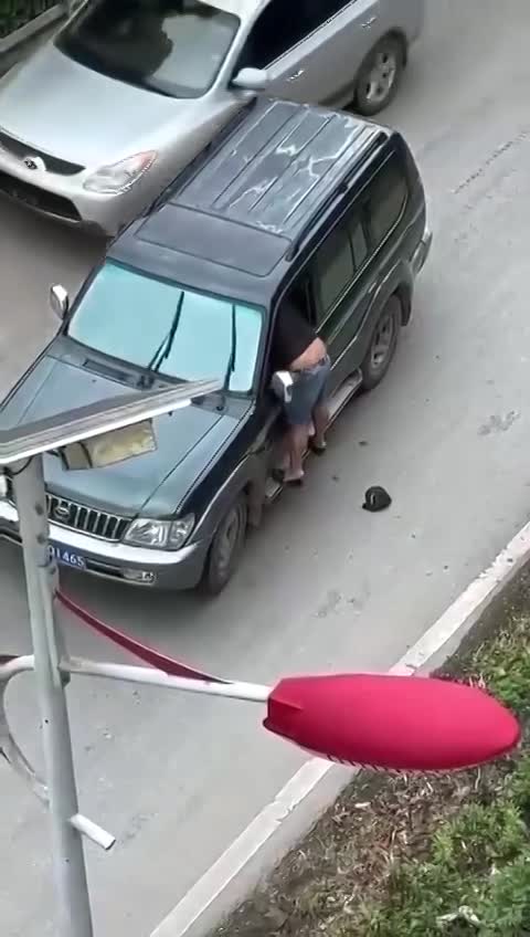 I don't understand why he held onto it for so long... He should've just either let it go, or climbed in. Not much he can achive dangling by the side of the car, anyway...