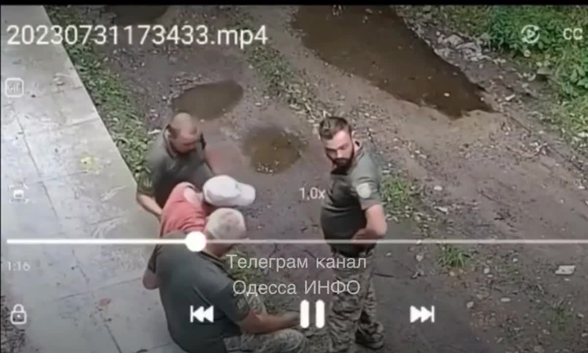 Ukrainian conscription officers give a little encouragement to a man in Odessa