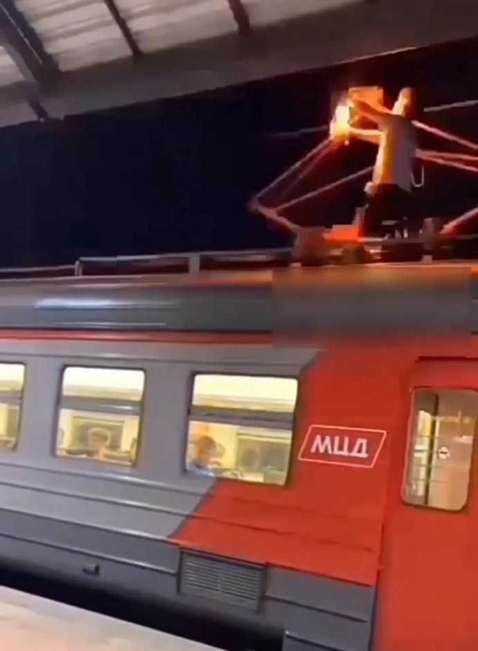 The footage shows how the guy grabs the current collector through a rag. He is electrocuted and falls onto the platform.