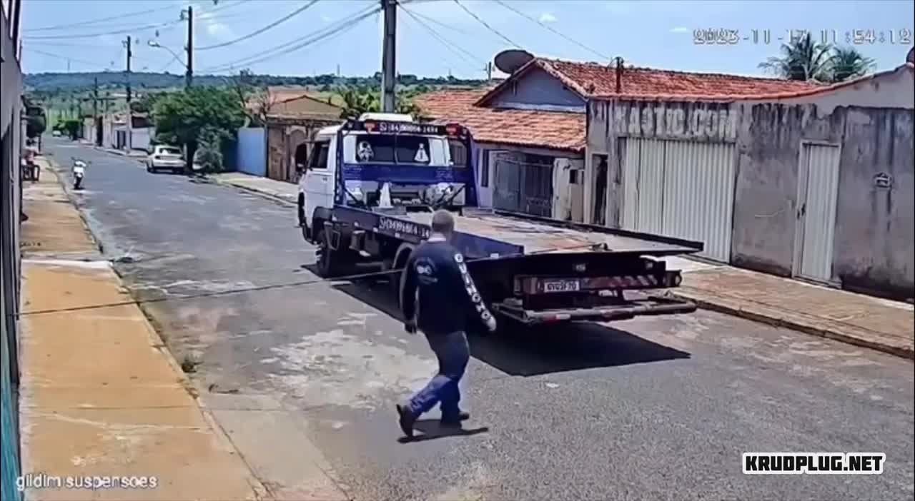 Hardly dumb for the biker - the truck driver put a cable across the road, not thinking to park near the kerb.