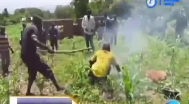 A man receives justice from vigilantes in a green field trying to burn the man to death with little fuel