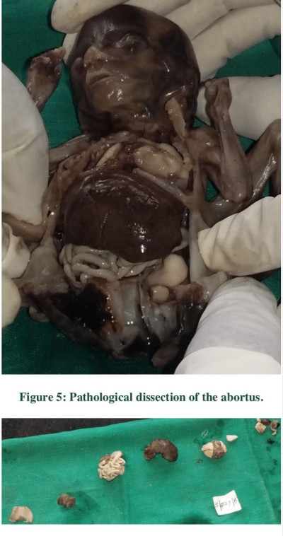 Heteropagus conjoined twin. One normal-looking head and thorax, a large omphalocele and four legs. (It is sometimes the case in conjoined twins that one of the twins is incomplete.) Mom had an abortion at 17 weeks.
