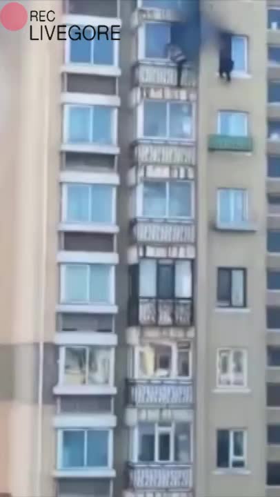 Harrowing video posted to social media shows a man on the edge of a window, and a second man coming out of a patio door. That second man manages to make it to safety, landing on a window below. The first man seated on the edge of the window tries dropping onto a railing below, but unfortunately falls all the way to the ground and to his death, the footage shows.