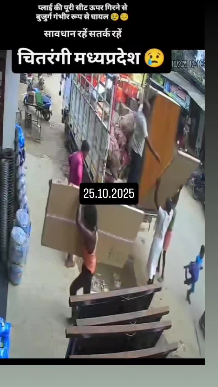 An elderly man was seriously injured when a full plywood seat fell on him.