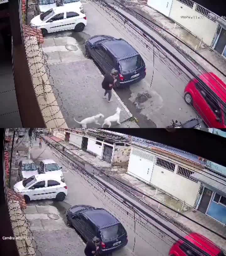 A security camera at a residence on Silva Neto Street in Realengo recorded the exact moment a woman was attacked by two pitbull dogs. The animals belong to a resident of the area who, according to neighbors, has not been controlling the dogs