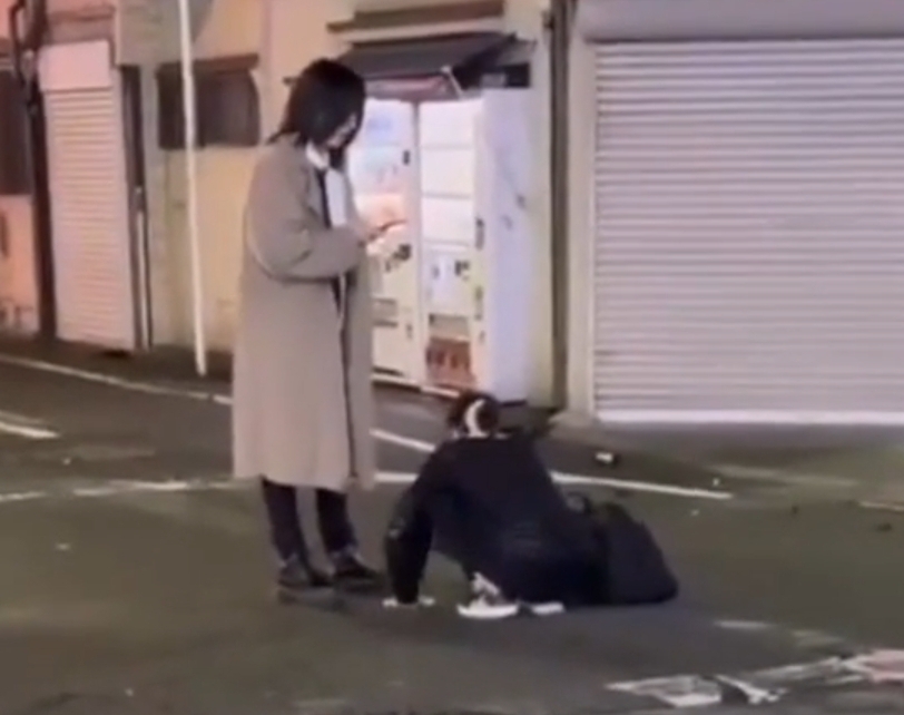 A drunk Japanese guy hits and drags his girlfriend down the street.
