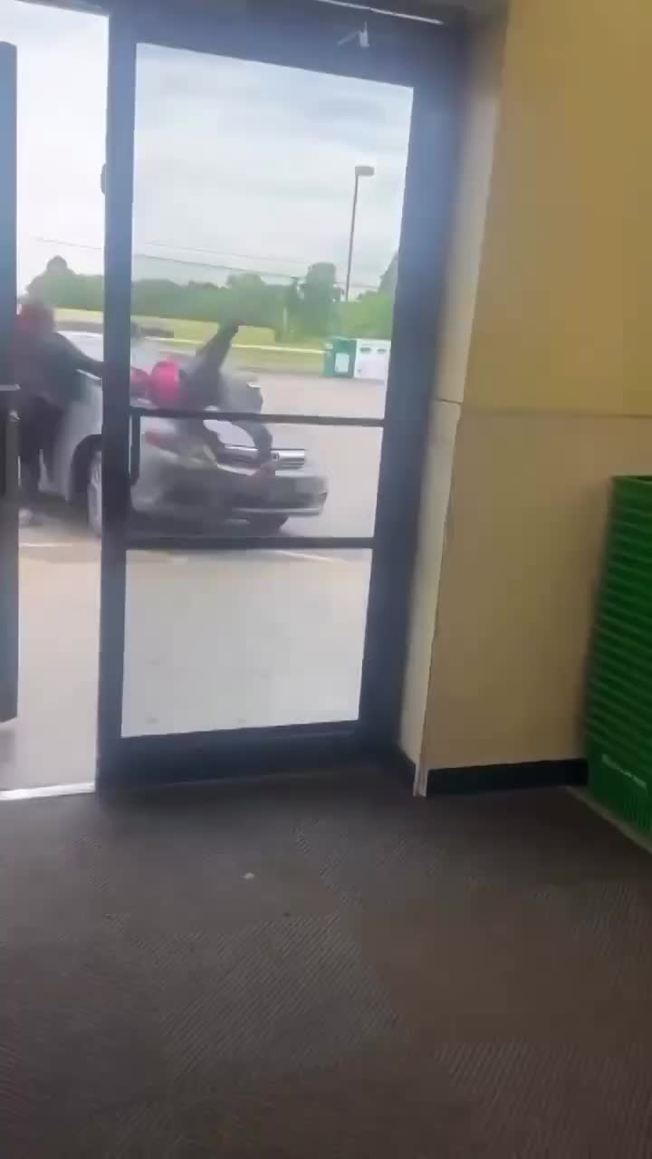 Car rams lady into store and she casually walks off then a fight breaks out in then parking lot