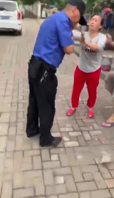Chinese police officer takes brick to the head.