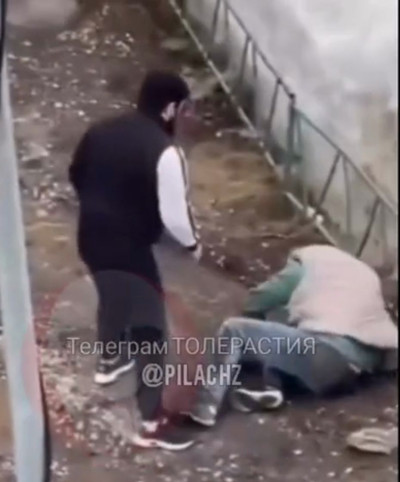 Muslim-looking-bitch gives an elderly man a very light beating in Russia.