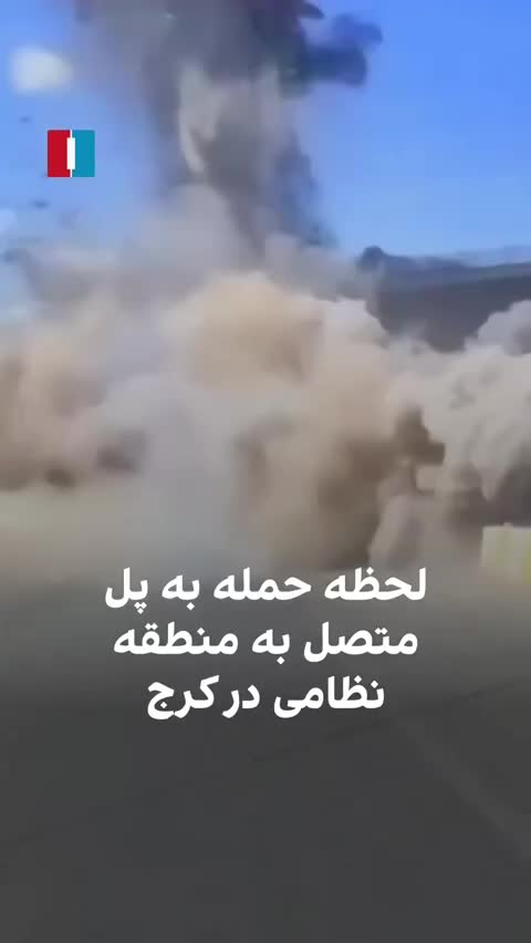 JDAM airstrike hitting a bridge west of Tehran, with several civilian vehicles passing underneath at the moment of impact.