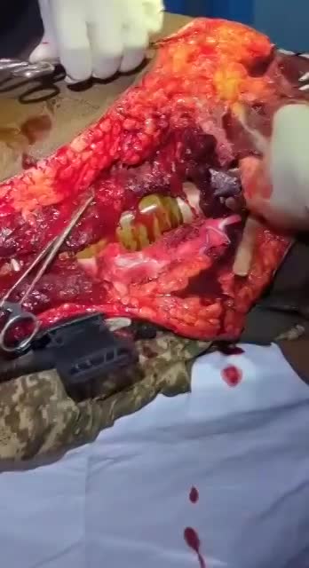 Videos of an unexploded SPG shell stuck inside a Ukrainian soldiers leg
