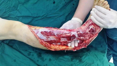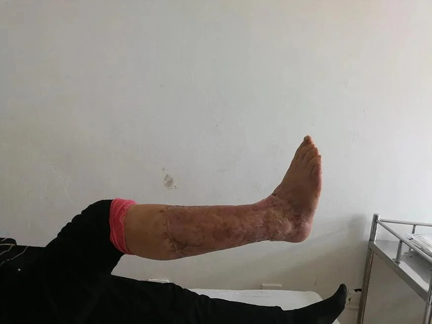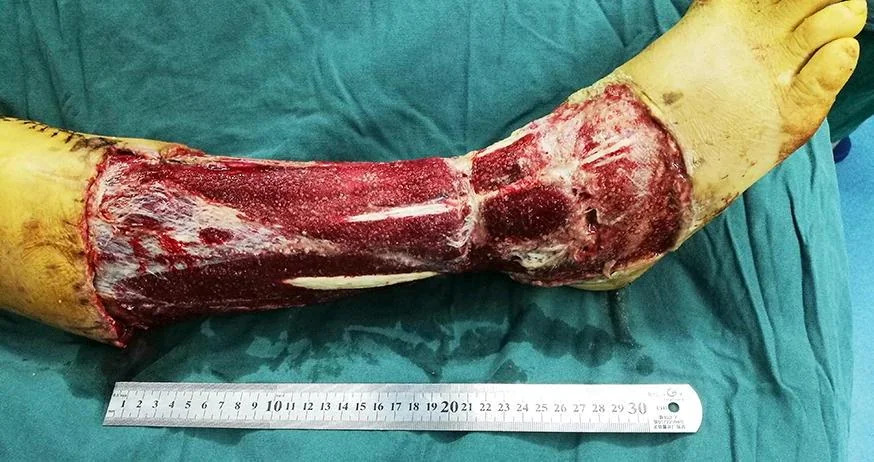 A 56-year-old female was run down by a car. Her right leg suffered extensive degloving injury from the knee right down to the back of the foot. The total wounded area, which added up to 1200 cm2, was severely contaminated and accompanied by circumferential multi-plane injury, fibula exposure and partial muscle rupture (Fig. 7). Blood pressure: 109/61 mmHg, heart rate: 84 beats/min, HGB: 98 g/L, HCT: 30.4%, albumin: 25.8 g/L, total protein: 52 g/L, PT: 12.2 s.