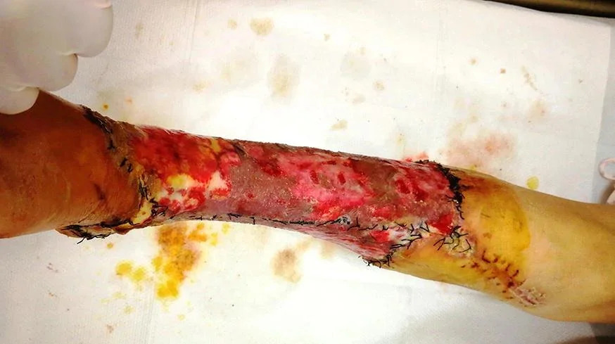 Ten days after the injury, we found that the granulation in the wounded area had been growing relatively slowly and that there were a small amount of residual necrotic tissues. Debridement was carried out, as well as a change of the VSD coverage.