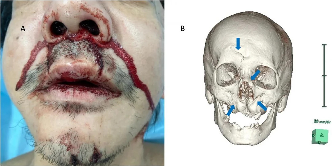 Fig 3: (A) Clinical photograph showing active bilateral epistaxis upon arrival at the emergency department. (B) Three-dimensional CT of the skull. Arrows indicate fractures.