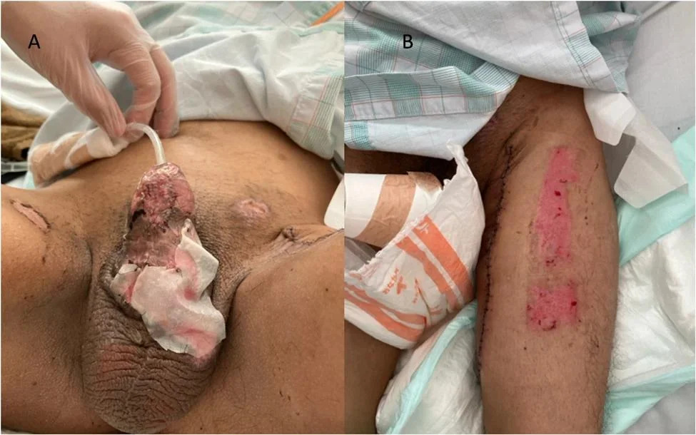 Graft viability was first assessed on postoperative day 5, in accordance with standard practice. Following confirmation of graft adherence, compressive dressing with cotton was reapplied and maintained for an additional two weeks. The urethral catheter was removed on day 22 post-admission. The patient was discharged on day 28 post-admission with instructions for continued wound care and follow-up. At the 3-month follow-up, the graft remained viable and the patient had regained full range of motion in the left hip. He reported no residual discomfort or altered sensation in the grafted area and was able to resume normal daily activities. Scarring was evident, but functional outcomes were good (Fig. 4). Urological and sexual function had recovered to pre-injury states. The patient did not attend the 7-month follow-up appointment.