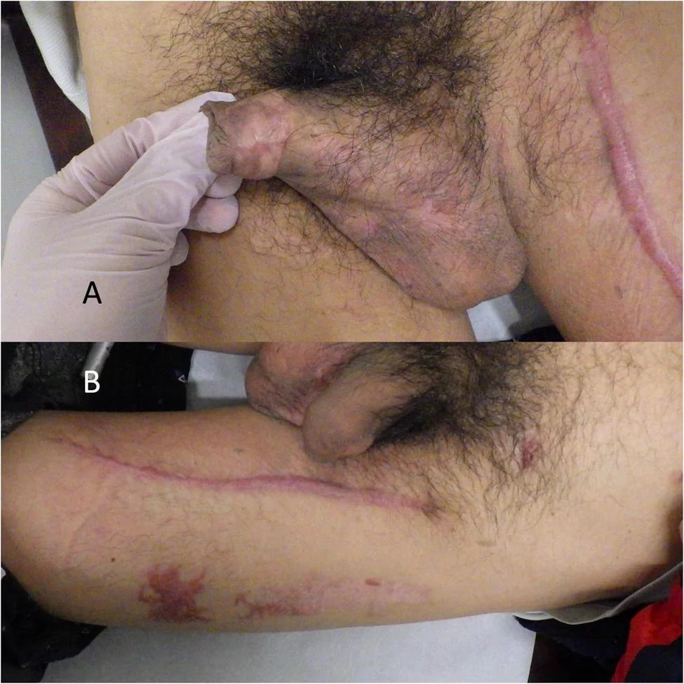 Fig 1: Three months later. Skin graft on penis and scrotum took. The thigh is scarred.