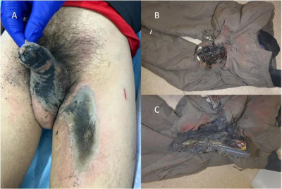 A 47-year-old man presented to the emergency department approximately 30 min after being involved in a motorcycle accident. He reported sustaining injuries when his motorcycle, traveling at approximately 40 km/h, collided with a parked car due to inattentive riding. He called an ambulance after experiencing bilateral epistaxis and upper limb pain. He further reported that his cell phone (brand and model unknown, but described as a smartphone less than 1 year old) had suddenly ignited while in the left front pocket of his trousers. He immediately felt intense heat and pain in his groin area. Upon removing the trousers, he observed flames and smoke emanating from the phone and a developing burn on his skin, which was extinguished spontaneously (Fig. 1A–C).