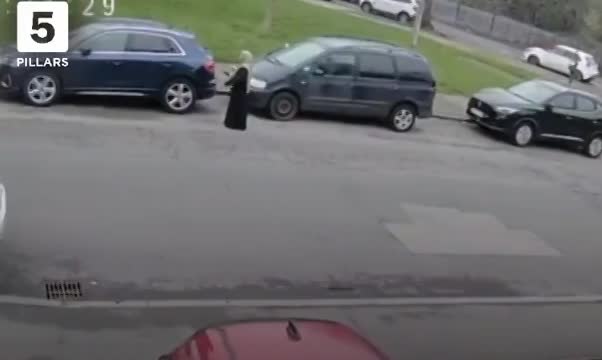 Decent driving skill. Doesn't appear much if any damage done to parked cars but took out scum.