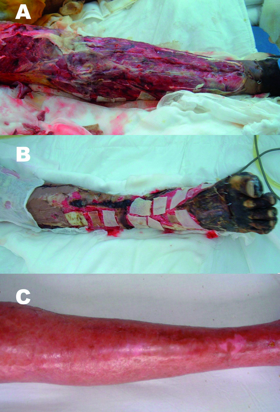 Fig 2: Muscular necrosis are seen in right calf (A); after repeated debridement and removal of necrosed muscular tissue, the tibia is exposed, which is covered with alloskin for protection (B); holes are drilled on the tibia, and the wound is closed with autoskin after granulation tissue formation (C).