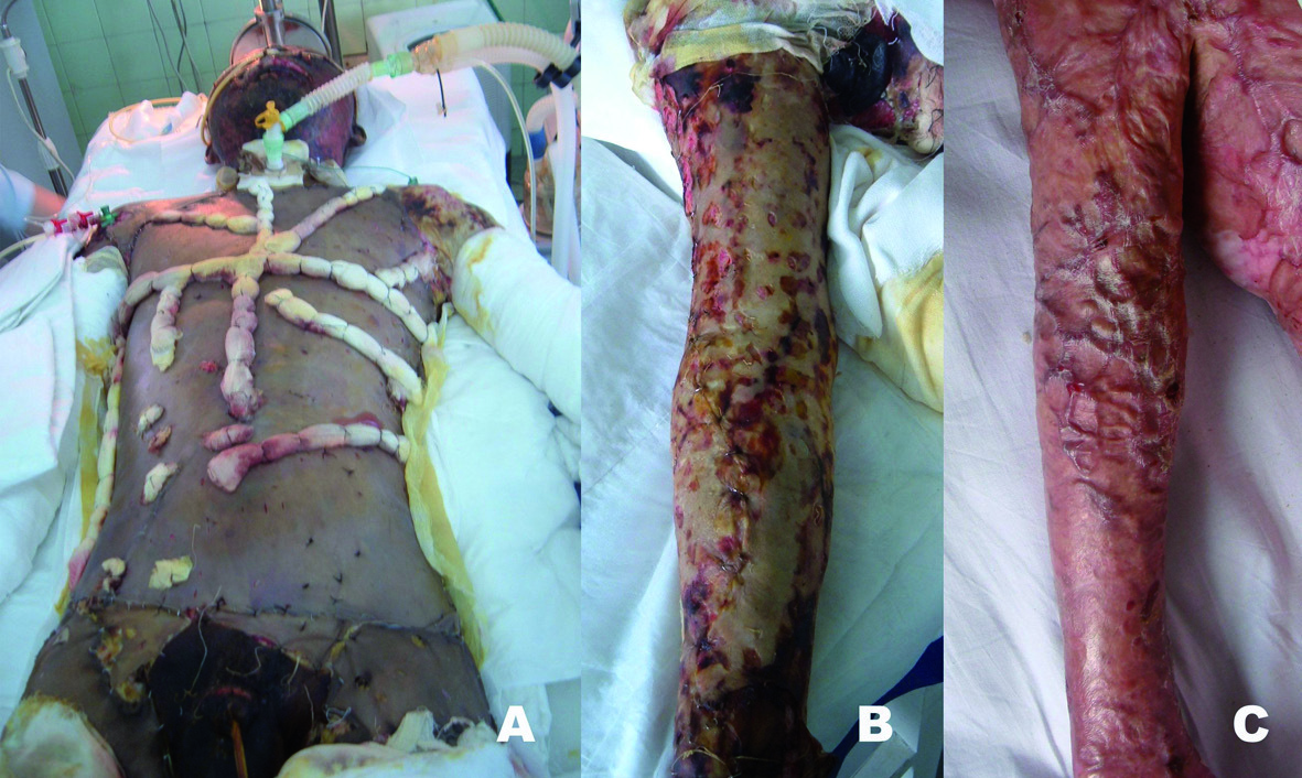 Fig 1: “Microskin autografting and alloskin repeated grafting” method to close the wound,the anterior trunk is cover with large pieces of alloskin to protect the wound (A); scalp microskin grafting of right upper limb was performed (B); mild scar proliferation is seen after healing of right upper limb (C).