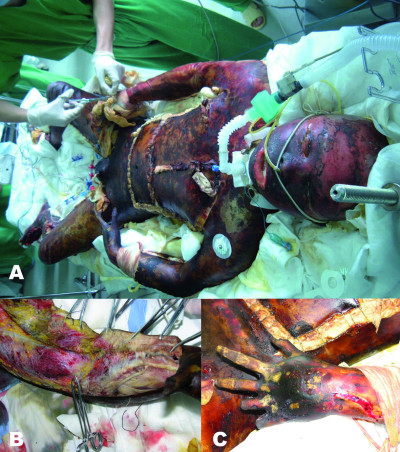 Fig 3: Extraordinary severe burn involving 99.5% TBSA (A); muscular eversion and necrosis are seen in left upper limb like fish meat (B); fingers of left hand are carbonized and necrosed like dry branches (C).