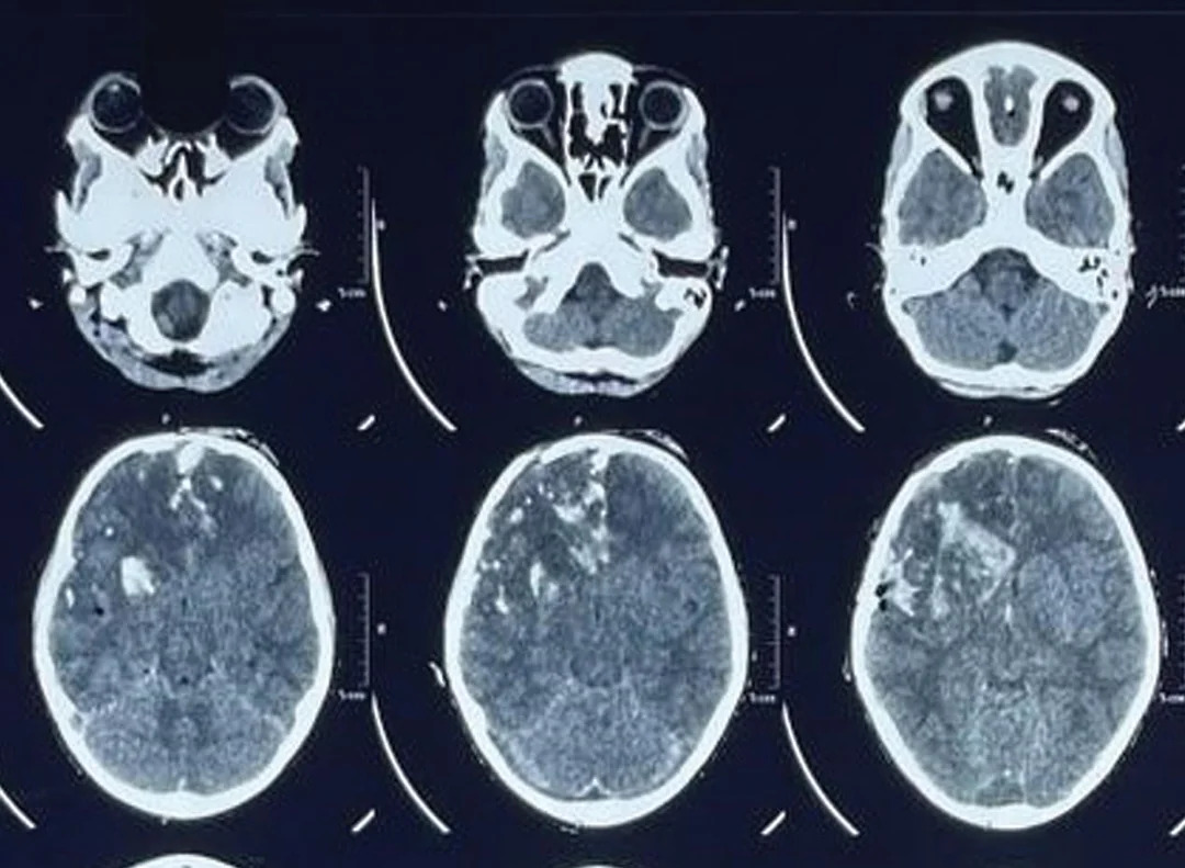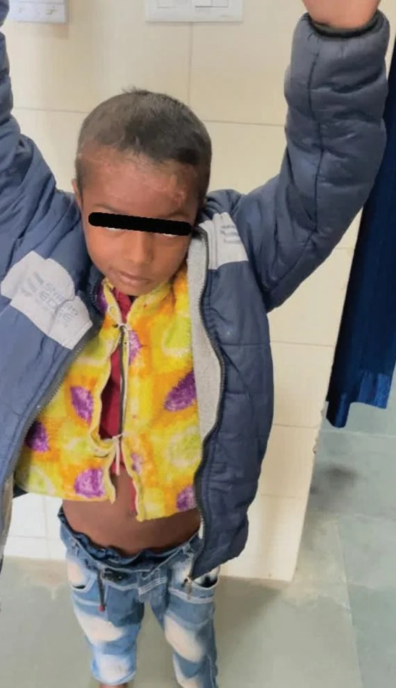 A 10-year-old male was brought to the emergency department of All India Institute of Medical Sciences (AIIMS) Patnawith the complaints of accidental fall on the fan blade of the thresher machine (►Fig. 1). On arrival, he had a Glasgow Coma Scale (GCS) of E1VTM5 status, bilateral pupil mid-dilated, and sluggish reaction to light. On secondary survey, he had a lacerated wound of size 15x4x2 cm extending from left side forehead to right temporal region exposing bone and brain parenchyma herniation through the wound (►Fig. 6). Baseline laboratory parameters showed hemoglobin of 12.1, total leucocyte count of 12,000, platelet count of 2,35,000, and serum Naþ of 136, Kþ of 4.2.
