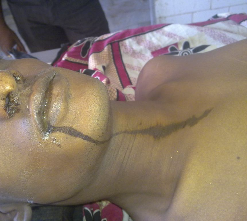 A 17 year old boy deliberately ingested sulphuric acid and was admitted in the hospital for treatment. The patient was in excruciating pain, had blood vomiting with cold clammy skin, sweating, blood pressure 80/50 mmHg, pulse 160/min and respiration rate 60/min. He was in a state of shock. There was rigidity and tenderness on palpation of abdomen. Ryle’s tube intubation was done and the toxic collection was aspirated. Humidified oxygen was administered. IV fluids, blood transfusion and antibiotics were also given as required. Endoscopy and surgery were planned to be done after the patient’s condition became stable. But he died within a day of the incident before doing any surgery. The deceased was sent for medicolegal autopsy. On autopsy it was found that he had some brownish black acid stains over the lips. Brownish black dribbling marks were found from the right angle of the mouth to front of the neck (Figure 1). Some brownish black stains were also seen around the nostrils. The conjunctiva was congested and nail bed was cyanosed. The oral cavity and the tongue revealed some blackish stains. On dissection, the mucosa of oesophagus was blackened and congested with some white semisolid substance in the lumen. There was extensive corrosion, blackening, disorganisation and perforation of the stomach (Figure 2). The perforation was massive, irregular, blackened and situated along its posterior aspect close to the cardiac end. Some acid digested blood was adhering to the gastric mucosa. The soft tissue surrounding it was fragile and the tear extended during dissection. There was spilling of the gastric contents and bile into the peritoneal cavity with peritonitis (Figure 3). The surface of the liver looked greenish black. All other internal organs were intact and congested. The stomach, a loop of intestine, 500gms of liver and half of each kidney were preserved in rectified spirit and sent for toxicological analysis. The chemical examiners report was positive for sulphuric acid in the viscera.