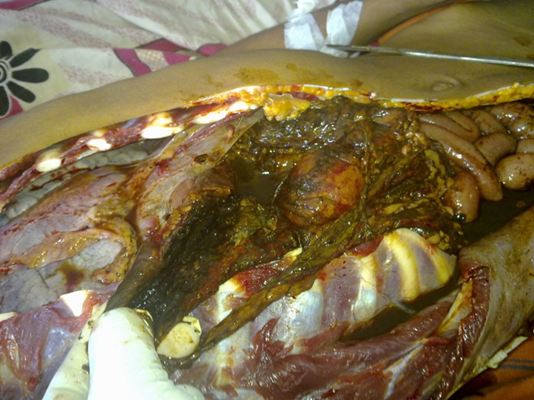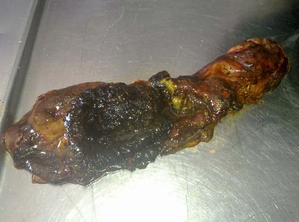 Fig 3: Blackened, friable upper GI tract with peritonitis