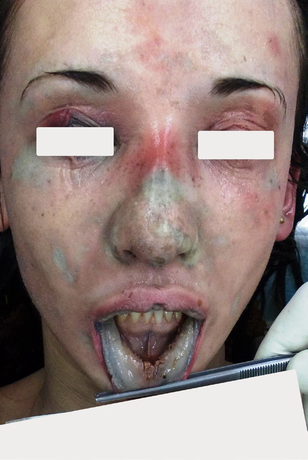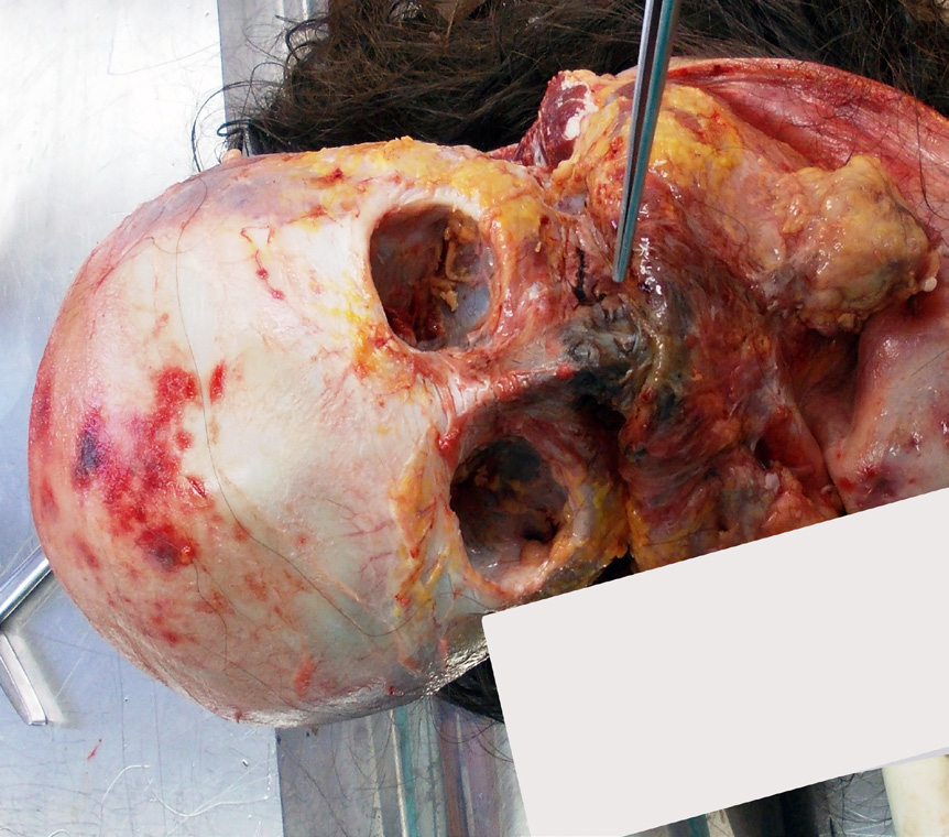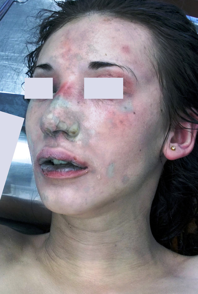 External examination of the body revealed the signs of immersion (pale and sodden body skin, macerated hands and feet skin, bright reddish hypostasis). The most prominent findings were multiple irregularly shaped grayish-white colored corrosive burns on the lips, nose, eyelids, and cheeks (Figure 5, Figure 4). There was also a recent skin hematoma in the nasal, orbital and forehead region, without facial bone fractures. Careful preparation of the skin and under-lying soft tissue from the skull revealed the presence of dark grayish discoloration of the subcutaneous nasal tissues and subcutaneous hematoma of the frontal and parietal region (Figure 3). The opening of the rib cage and abdominal cavity revealed an unpleasant smell of the strong pungent odor. The oral cavity, esophageal and tracheal mucosal surfaces were swollen with grayish discoloration. A