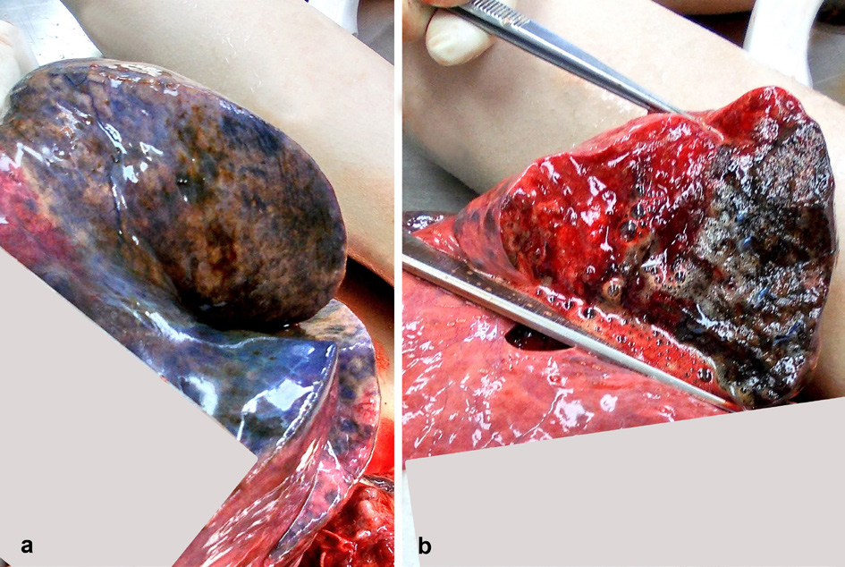 Fig 2: a) Corrosive lesions of the lower pulmonary lobes due to acid aspiration; b) Necrotic and hemorrhagic areas of the pulmonary cutting surfaces.