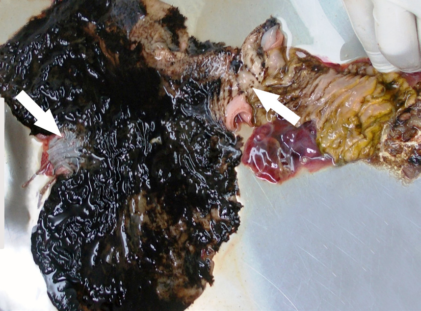 Fig 1: Extensive necrosis of the gastric mucosa (arrows pointing to a sharp border to the esophagus and pylorus).