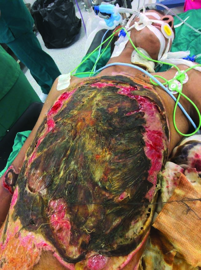 Fig 3: Anterior trunk shows fourth-degree burn involving the thoracic cage (sternum, ribs, and costal cartilages).