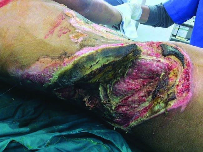 Within 2 weeks, the fourth operation was carried out by the plastic surgery team; the anterior trunk and the posterior aspect of the left arm were covered by split-thickness skin grafts (meshed 1:3). Maturation of the grafted areas and healing of the donor site (right thigh and leg) lasted 4 weeks. Meanwhile, the posterior trunk showed creeping of the granulation tissue of the right iliac bone except for the posterior lip. Thereafter, the patient was prepared for the last operation. The orthopaedic surgery department collaborated with plastic surgeons, and we excised the posterior lip of the iliac crest. The posterior trunk and left thigh were then reconstructed by split-thickness meshed (1:3) skin grafts.