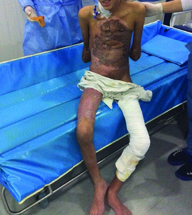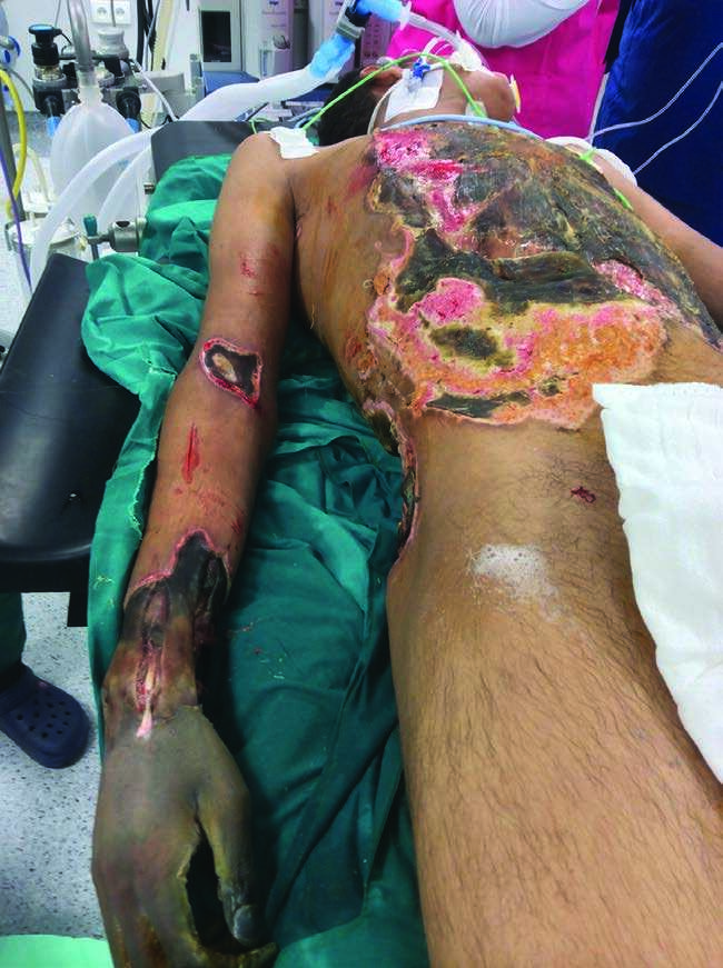 Fig 2: Patient on table just before the first operation (mummified right hand and distal forearm, anterior trunk, and lower posterior trunk show third- and fourth-degree burns with severed tissues).